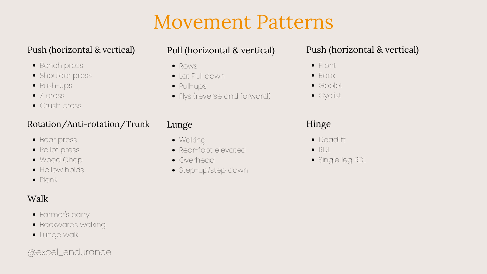 The big 7 patterns: - Push - Pull - Squat - Hinge - Carry - Lunge - Rotation/Anti-rotation